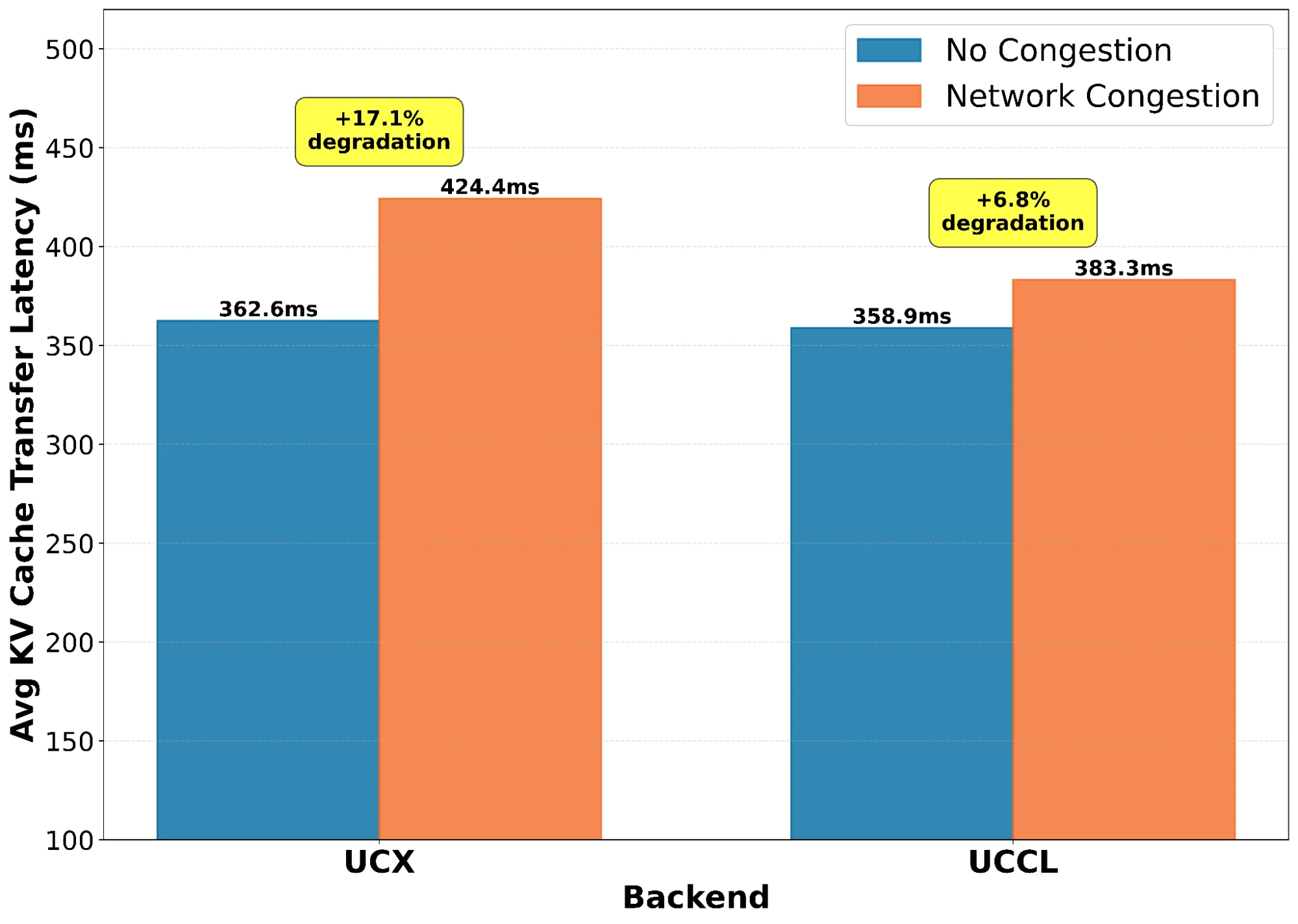Figure 5: PD transfer latency growth under congestion. Comparing baseline vs. congested states for UCX and UCCL transport.